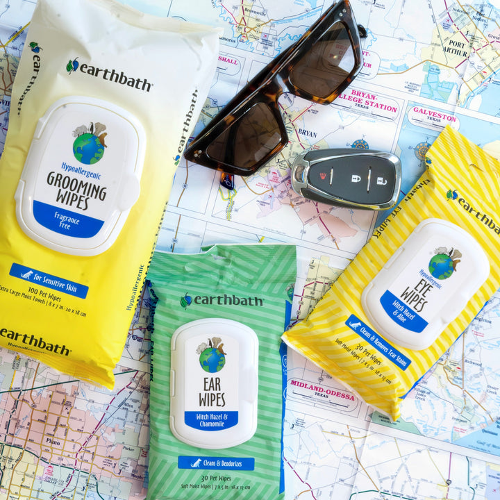 Collection of Earthbath pet care products including bottles and wipes on a white backgroundCollection of Earthbath pet care products including bottles and wipes on a pink background